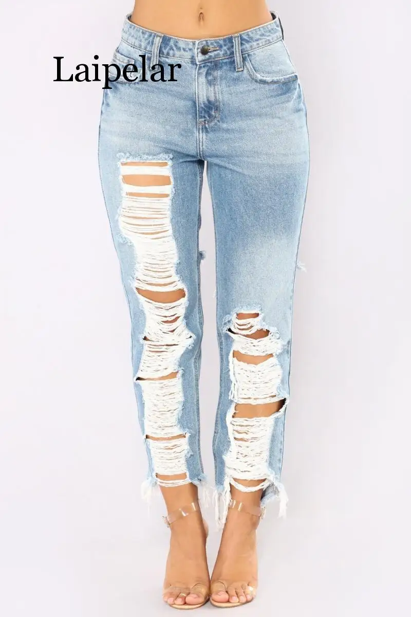 Images of Laipelar 2019 Casual Long Jeans Women High Waist Skinny Pencil Blue Denim Pants Ripped Hole Skinny Slim Jeans Women Plus Size :